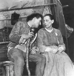 Описывая постановку «Мамаши Кураж» в «Берлинер ансамбль», Брехт показывал, сколь существенно могли изменяться отдельные сцены в зависимости от того, кто исполнял в них главные роли[97]. Так, в сцене из второго действия, когда за торгом по поводу каплуна между Анной Фирлинг и Поваром зарождаются «нежные чувства», первый исполнитель этой роли, Пауль Бильдт, привораживал Кураж тем, как, не сойдясь с ней в цене, он острием ножа вытаскивал из мусорной бочки протухшую говяжью грудинку и «бережно, словно какую-то драгоценность, хоть и воротя от неё нос», относил её на свой кухонный стол[98]. Буш, введённый на роль повара-ловеласа в 1951 году, дополнил авторский текст игривой голландской песенкой. «При этом, — рассказывал Брехт, — он сажал Кураж к себе на колени и, обняв её, хватал за грудь. Кураж подсовывала ему под руку каплуна. После песенки он сухо говорил ей на ухо: „Тридцать“»[98].