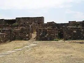 Нижняя часть внутренних помещений крепости была также сложена вперемешку из базальтовых и туфовых камней, верхняя из сырцевого кирпича. Археологические раскопки позволили установить, что в качестве дверных балок использовался толстый деревянный брус, двери были деревянные и массивные толщиной 12 см, крыша состояла из деревянных балок переплетенных камышом[6].