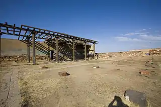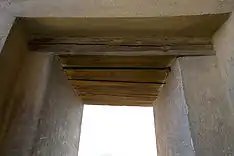 | Перекрытие двери внутреннего помещения, выполненное из деревянного бруса. Реконструкция по материалам археологических раскопок. | Крыша внутреннего помещения: деревянные балки, покрытые камышом. Реконструкция по материалам археологических раскопок. | Каменная лестница в хозяйственные помещения. |