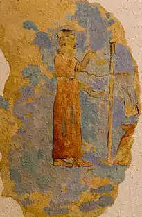 | Фрагмент перистильного двора храма бога Халди, реконструкция. | Изображение бога Халди, настенная роспись храма, реконструкция. | Вход в храм «Суси». |