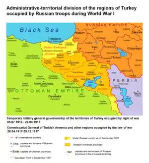 В 1916 году во время Первой мировой войны город был взят русской армией (см. Эрзурумская операция). С февраля 1916 по декабрь 1917 года город находился под контролем России. По сообщениям прессы того времени, около 25 тыс. армян вырезано в городе до прихода русской армии[20], а в целом, к лету 1916 года «65 тыс. армян из города Эрзерум и его окрестных деревень были доведены до смерти или умерли в изгнании»[21].