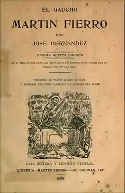 В отеле, на грубой коричневой бумаге записной книжки из маленького магазинчика, Эрнандес завершил набело некоторые поэмы о любви, а также семь песен, представляющих собою первую часть поэмы «Гаучо Мартин Фьерро»[31]. Главный герой поэмы назван в честь Мартина де Гуэмеса — предводителя кавалеристов-гаучо, героя Войны за Независимость Южной Америки, который остановил войска испанского короля на Северо-Востоке[32], в то время как Сан-Мартин, при поддержке Пуэйрредона, присоединился к кампании на Северо-Западе, перешагнув через Анды… Первая часть книги, известная как «Прибытие», публиковалась в журнале «Republica»[33] отдельными главами, начиная с 28 ноября 1872 года. В дополнение к поэме было опубликовано письмо автора своему другу и редактору Хосе Мигенсу. Поэма представляет собой страстный протест против унижения и закабаления гаучо. Эрнандес взял под свою защиту эту нацию, не только подвергшуюся бесчеловечной эксплуатации, но и оказавшуюся под угрозой физического уничтожения в результате политики, проводившейся унитариями[34]. Хосе Эрнандес отлил трагедию народа в металле своей поэзии. Он создал образ Мартина Фьерро — бродячего певца, который, подобно средневековым трубадурам, странствует из деревни в деревню, рассказывая о том, что близко сердцу любого гаучо. Вначале Мартин повествует о себе, вспоминает счастливую жизнь, которую когда-то вели вольные гаучо, вспоминает и принесенные солдатчиной страдания. Жизнь на границе — это побои, это каторжный труд и всевозможные лишения![16]. Выразительностью своего языка, богатого на образы, взятые из жизни, история несчастий Мартина Фьерро слилась с народными традициями и превратилась в национальную поэму, глубокую и тревожно прижившуюся в народном сознании вплоть до наших дней.