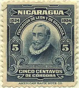 ![]() Никарагуанская марка с изображением Франсиско Эрнандеса де Кордобы, выпущенная к 400-летию основания Гранады и Леона | |