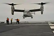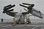 Запаркованный на палубе вертолетоносца №181 Хюга конвертоплан СкопаV-22 262-й эскадрильи КМП США(2013 г.)