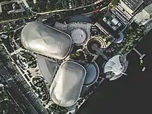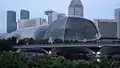 Оригинальный дизайн, представленный публике в 1994 году, состоял из стеклянных корпусов без сечений, сначала вызвал критику со стороны общественности. Критики также отмечали, что дизайн не чувствителен к расположению и климату Сингапура, поскольку это создало бы оранжерею в тропическом климате Сингапура[8] К окончательному дизайна зданий были добавлены солнцезащитные элементы. Уникальный архитектурный дизайн имеет вид, похожий на тропический фрукт дуриан или на глаза мухи.[9] Более 7000 треугольных алюминиевых солнцезащитных элементов, которые покрывают две его круглые стеклянные конструкции из стекла, выглядели как шипы на двух половинах плода дуриана.[10]