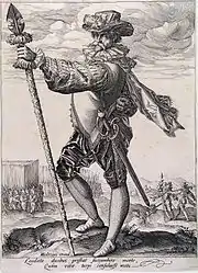 Офицер с эспонтоном, фрагмент картины 1635 года. Статус подтверждается надетым через плечо офицерским шарфом.