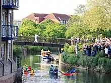 По воде факел перемещался на моторной лодке в Бристольской гавани[26][27] и в спасательной шлюпке RNLI через пролив Менай.[28] Было ещё неторопливое плавание на пароме Мерси[29] и на пароходе MV Tern через озеро Уиндермир.[30][31] Без использования мотора факел возили на панте вниз по течению по реке Кам в Кембридже[32], и на гребной лодке по реке Медуэй в городе Мейдстон[33]. Его последний отрезок пути к Олимпийскому стадиону 27 июля прошёл на катере, которым управлял футболист Дэвид Бекхэм, по реке Темза.[34]