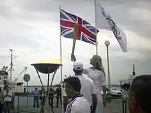 Факел прибыл на церемонию на борту катера, управляемого Дэвидом Бекхэмом по Limehouse Cut, старейшему каналу на реке Темза в Лондоне. Стив Редгрейв получил пламя от молодого футболиста Джейда Бейли, факелоносца на катере, и принёс его на Олимпийский стадион.[34] Редгрейв передал факел группе из семи молодых спортсменов, чтобы они пронесли его по стадиону. Молодые спортивные надежды Британии от него ещё 6 факелов и прошли к центру стадиона, где зажгли олимпийский огонь всеми семью факелами, который состоял из 204 пылающих лепестков[54][55][56] Это было в первый раз после летних Олимпийских играх 1976 года, когда олимпийский огонь зажгли молодые спортсмены; в 1976 году это сделали представитель французской Канады и представитель английской Канады вместе[57].