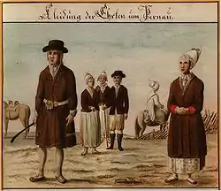 Костюмы юга Эстонии, слева направо: наряд Кадрина, костюм Михкли (о-в Сааремаа), наряд сету, наряд Пайсту (Вильяндимаа)