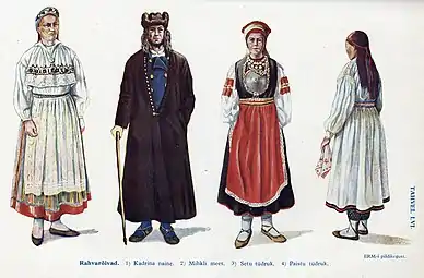 С XI—XIII веков на прибалтийско-финское население Ливонии в европейских источниках начинает происходить перенос этнонима "эсты". Тогда же появляются ранние сообщения об их одежде. Основной одеждой женщины были льняная сорочка и шерстяной сюртук. Вокруг бёдер обматывали шерстяную юбку, которую закрепляли поясом. Льняную одежду отбеливали добела, верхняя одежда была овчинно-белого или чёрного цвета. Шерсть для юбки красили растительными травами; самым распространённым красителем был калган, из которого получали красный цвет.