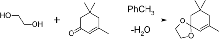 - для защиты карбонильной группы путём получения 1,3-диоксолана. Обработкой вещества с карбонильной группой в бензоле или толуоле этиленгликолем в присутствии кислого катализатора (толуолсульфоновой кислоты, BF3•Et2O и др.) и азеотропной отгонкой на насадке Дина-Старка образующейся воды. Например, защита карбонильной группы изофорона