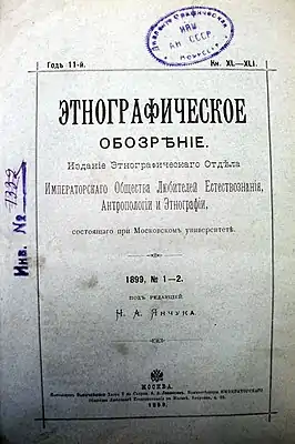 ![]() Титульный лист «Этнографического обозрения». Кн. XL—XLI. (1899. № 1—2) | |
