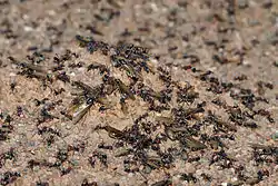 Среди других эусоциальных групп отмечают также колониальных тлей, некоторые виды трипсов,[5] креветок и жуков-грибовиков. Креветки рода Synalpheus живут в полости внутри губок, где находится размножающаяся самка в окружении рабочих особей и одна из них охраняет в неё вход. Жуки Austroplatypus incompertus (плоскоходы) и рода Pselaphacus из семейства грибовиков (Erotylidae) держатся группами и ведут своих личинок к грибам, которые те потом будут поедать[8][13]. Обнаружены проявления эусоциальности также у плоских червей Himasthla[14].