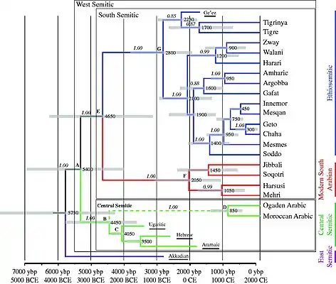 В недавнем исследовании было предположено[кем?], что эфиопская семитика была завезена в Африку из Южной Аравии примерно 2800 лет назад, и что это внедрение этиосемитов претерпело «быструю диверсификацию» в Эфиопии и Эритрее[2].