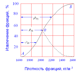 Графические методы базируются на использовании кривых разделения Тромпа. По результатам фракционного анализа продуктов обогащения строят кривую извлечения фракций, из которой определяют плотность разделения ρр (плотность фракции, извлечение которой равняется 50 %), среднее вероятное отклонение Еpm = (ρ75 - ρ25)/2 и коэффициент погрешности разделения J = Еpm / ρр - 1000, которые используют как критерии эффективности разделения, а также как показатели для оценки технологической пригодности обогатительных аппаратов.