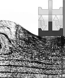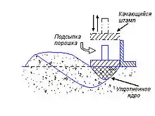 «Текучий клин» образуется только в том случае, если уплотняемая среда открыта хотя бы с одной стороны. Момент полного образования этого клина под штампом на всю глубину (до дна формы) характеризуется эффективным обратным выдавливанием материала из-под штампа в сторону незаполненной части формы и вверх. При этом выдавливаемый материал имеет вид волны.