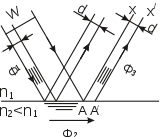 На рисунке приведена схема сдвига Гуса — Хенхен. W — ограниченная плоская волна. Ф1, Ф2 и Ф3 — три потока энергии, равенство которых вытекает из закона сохранения энергии. Из этого равенства Ренар[5] вывел, что величина сдвига Гуса — Хенхен определяется зависимостями:
