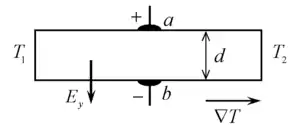 Суть эффекта состоит в том, что в полупроводнике появляется электрическое поле , перпендикулярное к вектору градиента температур и вектору магнитной индукции , то есть в направлении вектора . Если градиент температуры направлен вдоль оси , а магнитная индукция — вдоль , то электрическое поле параллельно вдоль оси . Поэтому между точками и (см. рис.) возникает разность электрических потенциалов . Величину напряжённости электрического поля можно выразить формулой: