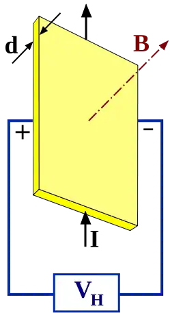 Если бы накопление заряда было положительным (как в некоторых металлах и полупроводниках), то значение VH на изображении было бы отрицательным (положительный заряд образовался бы на другой — левой стороне).