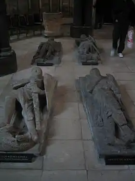 В Западной Европе до распространения эффигий крышки гробниц представителей церковной и светской знати нередко украшались плоскими латунными брассами с изображениями усопших.