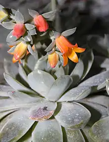 Имеет компактную розетку голубоватых листьев. С возрастом формирует длинный стебель и переходит к ампельному росту. Наиболее устойчивый в культуре вид — сочетает относительную теневыносливость и способность долго противостоять избыточному поливу. Оранжево-жёлтые цветки появляются в середине и конце лета на небольших боковых черешках.
