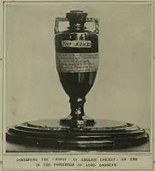 - «Когда осенью Английская команда XI[11] поехала в Австралию, много говорилось о том, что они поехали туда чтоб „заполучить“ прах. Англия выиграла два из трёх тестов, игравшихся против Австралийской XI. После третьего матча группа мельбурнских леди поместила немного пепла в маленькую урну и подарила её мне как капитану команды Англии»[12].