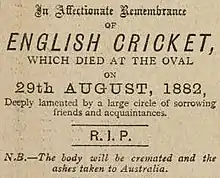 Это знаменательное поражение имело большой резонанс в британской прессе. 9 сентября в журнале Punch появилось стихотворение с упоминанием о Демоне[7] из страны кенгуру, а 2 сентября в The Sporting Times появился знаменитый некролог.