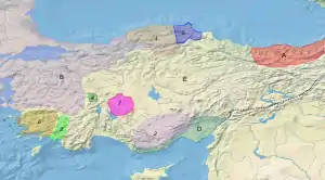 ![]() Бейлики в 1284 году. * A Трапезундская империя * B Византийская империя (до 1261 Никейская империя) * D Киликийская Армения * E Государство сельджуков * 1 Чобаногуллары * 2 Караманогуллары * 3 Инанчогуллары (Ладик) * 4 Сахиб-атаогуллары * 5 Перванеогуллары * 6 Ментешеогуллары * 7 Эшрефогуллары |
