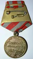 Медаль при помощи ушка и кольца соединяется с пятиугольной колодкой, обтянутой шёлковой муаровой серой лентой шириной 24 мм. Посередине ленты широкая красная полоска шириной 8 мм, по краям ленты узенькие красные полоски шириной по 2 мм.