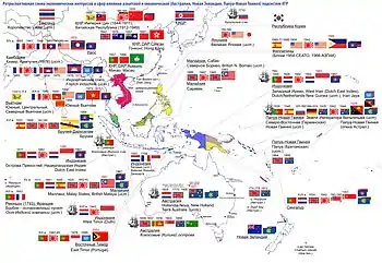 Представленная укрупненная схема экономических интересов и сфер влияния азиатской и океанической подсистем АТР построена по принципам, приведенным в тематическом разделе статьи История Океании со следующими добавлениями: