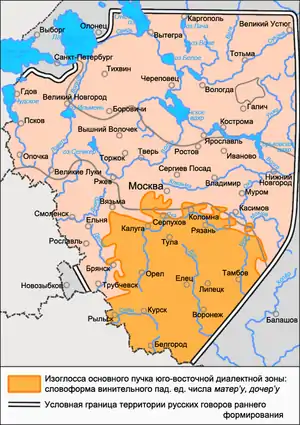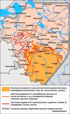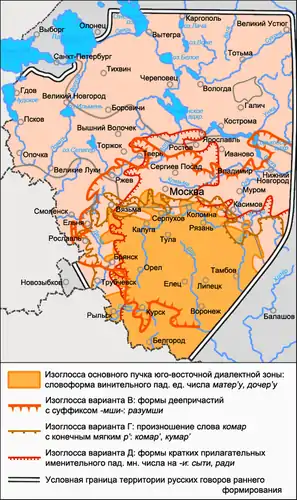 - Наличие форм винительного падежа единственного числа существительных мать и дочь, образованных с суффиксом -ер- и окончанием -у: ма́тер’у, до́чер’у (см. карты пучков изоглосс 1, 2, 3). В других говорах русского языка распространены такие формы существительных мать и дочь, как[58]: ма́ти, до́чи в именительном падеже — ма́тер’, до́чер’ в винительном падеже, отмечаемые в говорах Вологодской и Онежской групп[59]; ма́тер’, до́чер’ и в именительном и в винительном падежах, известные в вологодских и белозерско-бежецких говорах[60][61] (также совпадение форм именительного — винительного падежей ма́тер’, до́чер’ известно в рассеянном распространении в псковских и южнорусских говорах); мат’, доч’ при форме винительного падежа мат’, доч’ — подобное совпадение форм именительного — винительного падежей встречается повсеместно, при этом их исключительное распространение отмечается в говорах центральной диалектной зоны, а также в части северо-западных и северо-восточных севернорусских говоров; мат’, доч’ — ма́тер’, до́чер’; мат’, доч’ — ма́тер’а, до́чер’а; ма́тер’, до́чер’ — ма́тер’у, до́чер’у; ма́тер’а, до́чер’а — ма́тер’у, до́чер’у — такие формы встречаются в рассеянном распространении в основном в говорах южного наречия в сосуществовании с другими формами — в курско-орловских и оскольских говорах отмечаются формы мат’ — ма́тер’а и мат’ — ма́тер’у[62][63], в рязанских — ма́тер’ (реже ма́тер’а) — ма́тер’у (реже ма́тер’)[64].