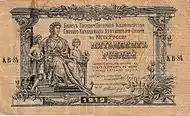 С 30 августа 1919 года началась осуществляться масштабная эмиссия новых добровольческих денег — так называемых деникинских «колокольчиков». Денежные знаки Юга России печатались в Ростове-на-Дону в здании бывшей конторы Государственного банка. К концу года колокольчики, однако, начали существенно обесцениваться из-за высоких темпов инфляции при лавинообразной эмиссии (150 деникинских рублей обменивались на 1 французский франк)[20]. Частично в магазинах, лавках, а также на некоторых предприятиях и в учреждениях началось кустарное изготовление собственных разменных знаков, выполнявших функции денег.[21]