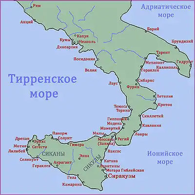 В VIII веке до н. э. юг Апеннинского полуострова стал объектом греческой колонизации, в связи с нехваткой продовольствия в Греческой метрополии и поиском новых торговых путей. Во второй половине века эта колонизация приняла столь широкий масштаб, что стала «Великой». На побережьях морей, омывающих юг полуострова, греками были основаны многочисленные города, в том числе Неаполь, Кротон, Сибарис, Бари. На Сицилии они основали Сиракузы, Мессину, Наксос и др.