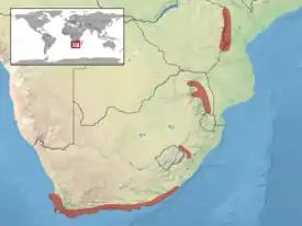 Изолированные популяции находятся в горных районах южной части Африки. Вид населяет различные места обитания, предпочитая относительно прохладные места с большим количеством осадков. В северной части ареала, где зима прохладная и сухая, а лето тёплое и влажное, вид встречается на высоте до 3000 метров над уровнем моря, в Зимбабве встречается на отметке ниже 1500 метров над уровнем моря.