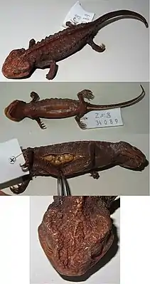 Общая длина животных от 12 до 15 сантиметров. Глава плоская и овальная, со слабо развитыми костными гребнями. Морда закруглённая. Тело стройное и уплощённое. Спинной гребень присутствует, но он невысокий и сегментированный. Помимо центрального имеются ещё дорсолатеральные гребни. Кожа грубая, гранулированная. Хвост меньше, чем туловище, сжат с боков.