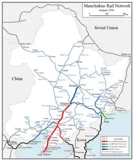 Хотя южно-маньчжурская железнодорожная линия (как и вся КВЖД) была первоначально построена с русской колеёй (1524 мм), во время русско-японской войны японцы перешили её на японскую (1067 мм) для удобства использования на ней японского подвижного состава. После окончания войны дорога была перешита на стандартную колею (1435 мм), с тем, чтобы сделать возможным её соединение с другими железными дорогами Китая.[2]
