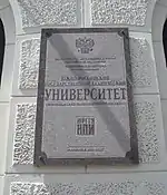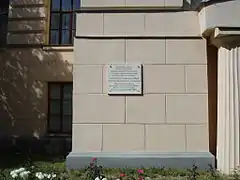 установлена на фасаде Главного корпуса 28 декабря 1985 года. В 2010 году, в связи с установлением на фасаде ВУЗа двух новых досок с названием учебного заведения на русском и английском языках, памятная доска была перемещена на правый флигель главного корпуса.