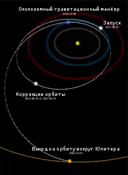 Запуск произведён 5 августа 2011 года. Для запуска использована ракета-носитель «Атлас-5» версии 551 c двигателем РД-180 российского производства[26]. Время полёта к Юпитеру составило 4 года 11 месяцев. Дата выхода на орбиту — 5 июля 2016 года[4]. Зонд планировалось направить по вытянутой полярной орбите с периодом обращения около 11 земных суток, с максимальным приближением к планете менее 5000 км[27][28]; летом 2015 года были внесены коррективы: решено изменить орбиту так, чтобы один оборот вокруг Юпитера зонд совершал не за 11 земных суток, как предполагалось ранее, а за 14.