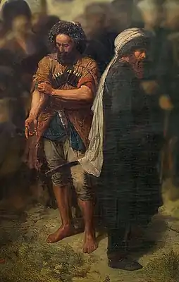 ![]() Юнус из Чиркея и имам Шамиль. Фрагмент картины Горшельта «Пленный Шамиль перед главнокомандующим князем Барятинским 25 августа 1859 года». | |