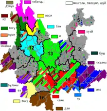 | 13 | Чусюн-Ийский автономный округ | 楚雄彝族自治州 | Chǔxióng Yízú Zìzhìzhōu | автономный округ | |