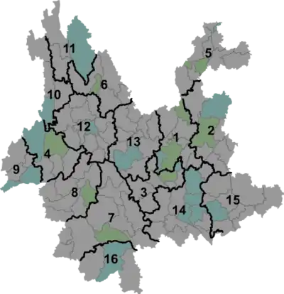 Юньнань делится на 8 городских округов и 8 автономных округов: