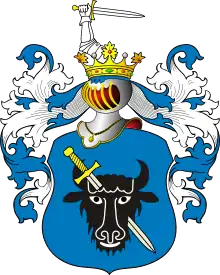 В щите имеющем голубое поле изображена бычачья Голова чёрного цвета, сквозь которую виден диагонально справа налево пронзённый серебряный Меч (польский герб Помян).