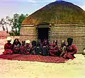 Семья текинца, сидящая на ковре перед юртой. Фото С. М. Прокудина-Горского (1911).
