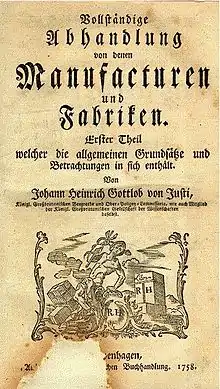 Иоганн Генрих Готлиб фон Юсти - один из главных представителей камерализма, многочисленные труды которого были посвящены учению о внутреннем государственном управлении, имеющем целью всеобщее благо, счастье каждого отдельного человека и всего общества. Поскольку экономическая деятельность, порождающая конкуренцию, разъединяет и разобщает людей, государство как особый социально-политический институт должно было взять на себя задачу приведения их к согласию.