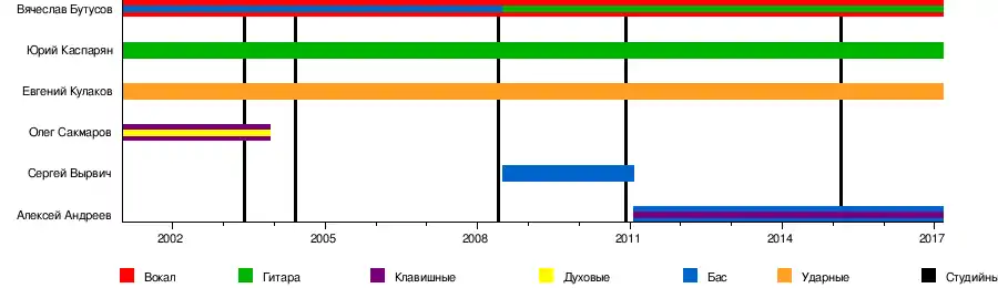 - Вячеслав Бутусов — вокал, электрогитара, акустическая гитара, 12-струнная гитара (2001—2017), бас-гитара (до 2005 года)