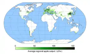 Всемирное производство яблок в 2005 г. составляло 55 млн т., стоимостью 10 млрд долл. Китай произвёл две пятых этого объёма. США — второй по величине производитель яблок, — 7,5 % от мирового производства. 60 % яблок, выращиваемых в США, произрастали в штате Вашингтон[19].