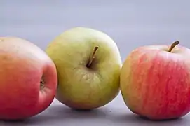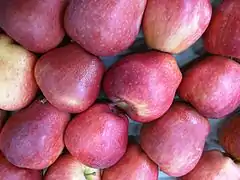 Я́блоко — сочный плод яблони, который употребляется в пищу в свежем и запеченном виде, служит сырьём в кулинарии и для приготовления напитков. Наибольшее распространение получила яблоня домашняя, реже выращивают яблоню сливолистную. Размер красных, зелёных или жёлтых шаровидных плодов 5—13 см в диаметре. Происходит из Центральной Азии, где до сих пор произрастает дикорастущий предок яблони домашней — яблоня Сиверса[1]. На сегодняшний день существует множество сортов этого вида яблони, произрастающих в различных климатических условиях. По времени созревания отличают летние, осенние и зимние сорта, более поздние сорта отличаются хорошей стойкостью.