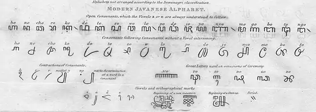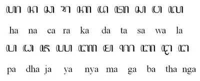 По принципу письма яванское письмо — абугида, содержит 20 знаков для согласных (по умолчанию означающих слоги, заканчивающиеся на «a»):