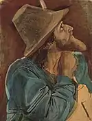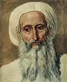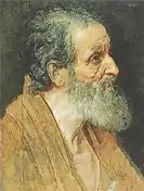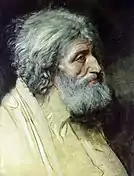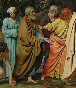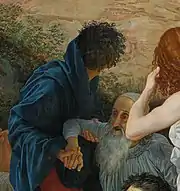 Между апостолом Андреем и Иоанном Богословом находится фигура седого апостола, которого в литературе называют «прислушивающимся» или «глухим»[172], — «из-за своей глухоты он не расслышал слов Иоанна [Крестителя], испытывает недоумение, хмурит густые брови и всматривается в лицо Андрея, старясь по нему угадать смысл случившегося»[171]. Название «прислушивающийся» этому апостолу дал Павел Третьяков[172].