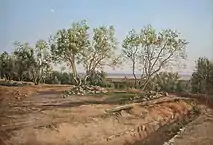 Важную роль при работе над картиной играли пейзажные элементы, которые были необходимы для создания достоверного художественного образа описываемого события[136]. На дальнем плане видны оливковые рощи, там же можно заметить белые здания Иерусалима. Горизонт замыкается цепью синеватых гор[137]. С самого начала работы над полотном Иванов стремился посетить Святую Землю и предпринимал неоднократные попытки осуществить такую поездку, но это ему так и не удалось. В результате художнику пришлось использовать в качестве «прообраза библейской Палестины» Римскую Кампанью[132]. В письме к отцу, отправленном в сентябре 1836 года, Иванов писал: «Я ездил за несколько миль от Рима для написания этюдов для околичности, которую теперь почти привёл в порядок. Не легко сочинить приличный ландшафт, а ещё труднее сочинить его отделку. Портретным образом работать ландшафты гораздо легче, чем идеальным…»[138][139]. В Третьяковской галерее хранятся 86, а в Русском музее — 15 живописных этюдов пейзажей для картины «Явление Христа народу». Пейзажные этюды, хранящиеся в Третьяковской галерее, подразделяются на «этюды деревьев» (21)[140], «этюды гор и далей» (39)[141] и «этюды почвы и камней» (26)[142].